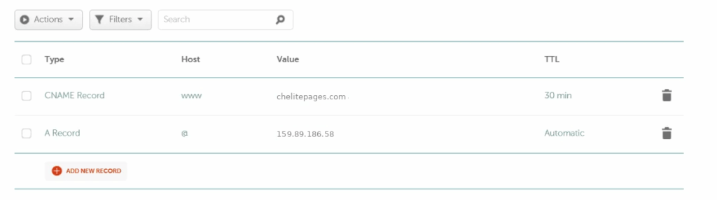 3. Add 1 CNAME record, with host = www, value = chelitepages.com and 1 A record with host = @ and value = 159.89.186.58 (make sure to copy and paste so there are no typos)
